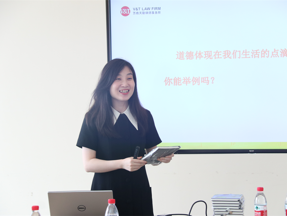 紧接着,王洁玉律师登场,为同学们带来了一场别开生面的道德与法治课堂。王律师深知青少年的认知特点,采用了案例分析、互动问答、情景模拟等多种生动有趣的教学方法。她结合生活中常见的法律问题,如校园欺凌、网络诈骗等,通过一个个鲜活的案例,引导同学们思考法律在生活中的重要性。在互动问答环节,孩子们积极踊跃地举手发言,提出自己的疑问和见解。王律师耐心地倾听每一个问题,用通俗易懂的语言给予解答,并鼓励同学们树立正确的价值观和法治观念。