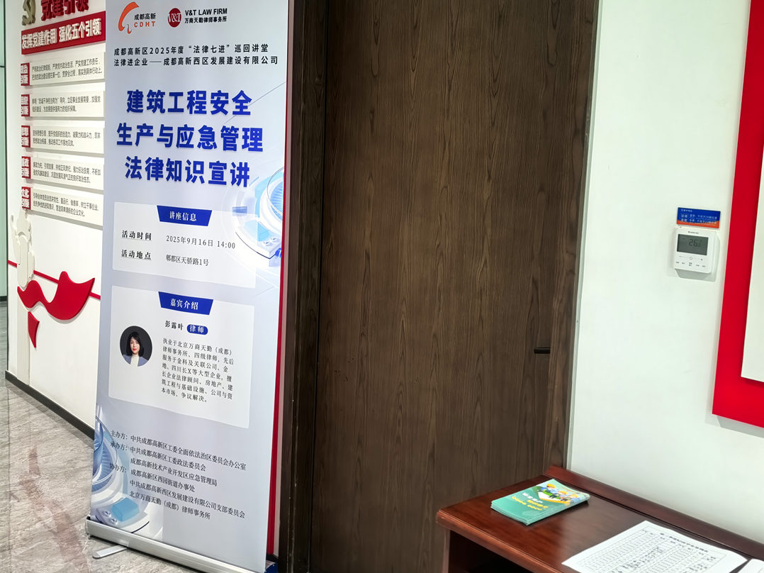 2025年9月16日,由中共成都高新区工委全面依法治区委员会办公室主办,中共成都高新区工委政法委员会、成都高新技术产业开发区应急管理局承办,成都高新区西园街道办事处、成都高新西区发展建设有限公司、万商天勤成都办公室协办的“法律七进”巡回讲堂第十期顺利举行。本期活动走进成都高新西区发展建设有限公司,以“建筑工程安全生产与应急管理法律知识宣讲”为题,开展普法活动。