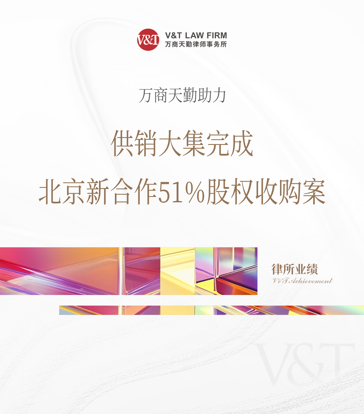 近日,中华全国供销合作总社旗下上市公司供销大集集团股份有限公司(以下简称“供销大集”)完成对北京新合作商业发展有限公司(以下简称“北京新合作”)51%股权的收购及交割手续。该交易对价约15.11亿元,金额庞大,法律关系与审批程序复杂,对法律服务的专业深度、响应速度与风险控制能力均提出了较高要求。万商天勤作为项目法律顾问,由北京办公室合伙人薛莲律师、刘江涛律师、李浩律师以及律师许潇、宋继鹏为本次收购提供了涵盖交易全周期的优质法律服务,具体包括交易方案的设计与论证、尽职调查、交易文件的起草与谈判、监管沟通与合规支持、交割执行及后续整合协同等多个关键环节,助力本次重大收购顺利落地。