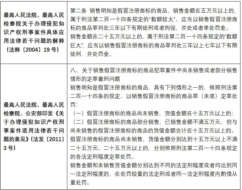 2004年《司法解释》、两高一部《关于办理侵犯知识产权刑事案件适用法律若干问题的意见》(法发〔2011〕3号)尚未结合刑修(十一)对销售假冒注册商标的商品罪相关规定作进一步修正,因刑法条文已发生实质性的修改,且未明确“其他严重情节”、“其他特别严重情节”情形,原司法解释对于该罪“销售金额”的数额规定与新刑法出现冲突,不能再径行适用,应优先适用新刑法,在无新司法解释可以作为适用根据的情况下,对于刑法条文的解释由法院根据条文修改的立法原意和罪责刑相适应原则作出判决。